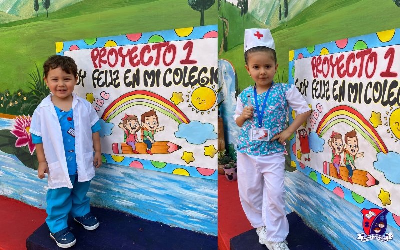 Por su parte, los niños de preescolar realizaron el cierre del proyecto “Soy feliz en mi colegio”, una actividad significativa en la que cada estudiante asistió disfrazado representando la profesión de sus padres. Además, se compartieron videos en los que los padres explicaban en qué consistía su trabajo, permitiendo a los niños conocer y valorar las diferentes profesiones.